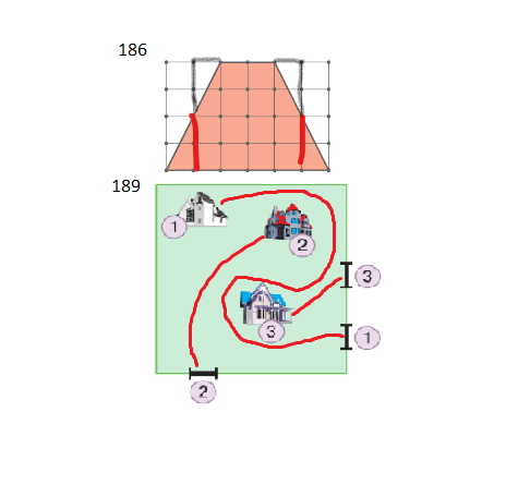 189 На квадратном участке расположены три дома, а в ограде сделаны три калитки. Проложи дорожку от каждого дома к калитке с тем же номером так, чтобы дорожки не пересекались. Нарисуй схему участка и дорожек в тетради. Дома перерисовы вать не надо — достаточно поставить номера.