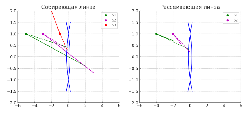 После прохождения через собирающую линзу свет, исходящий из одной точки, может либо сходиться в одной точке на другой стороне линзы (если объект находится за фокусом), либо расходиться так, что его продолжения пересекаются в определённой точке (если объект находится ближе фокуса).