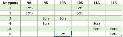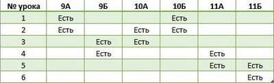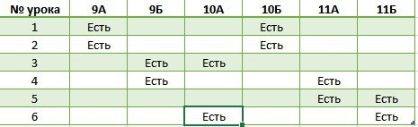 5. Использование табличной модели часто облегчает решение информационной задачи. В следующей таблице закрашенные клетки в расписании занятий соответствуют урокам физкультуры в 9-11 классах ш колы.