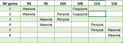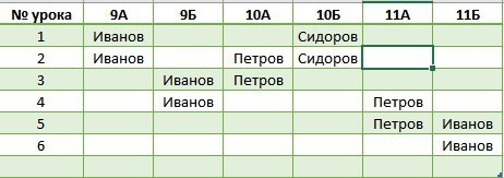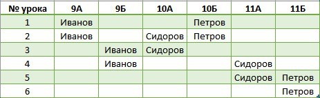В школе три учителя физкультуры: Иванов, Петров, Сидоров. Распределите между ними уроки в таблице так, чтобы ни у кого не было "окон" (пустых уроков).