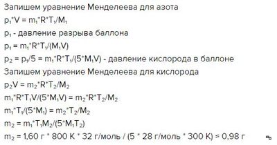 Определите массу кислорода, который можно хранить при температуре t₂=27 C в баллоне, имеющем пятикратный запас прочности, если при испытании такой же баллон с азотом массой m₁=1,60 г разорвался при температуре t₁=527°C. Пятикратный запас прочности означает, что давление в баллоне не должно превышать 1/5 давления, при котором баллон разрушается.