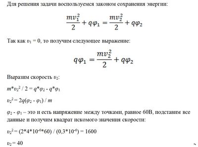 Тело массой m=0,30 мг, заряд которого q=4,00 мкКл, перемещается горизонтально в электрическом поле из одной точки в другую. Напряжение между точками U=60,0 В. Скорость тела в начальной точке равна нулю. Чему будет равна скорость движения тела в конечной точке?
