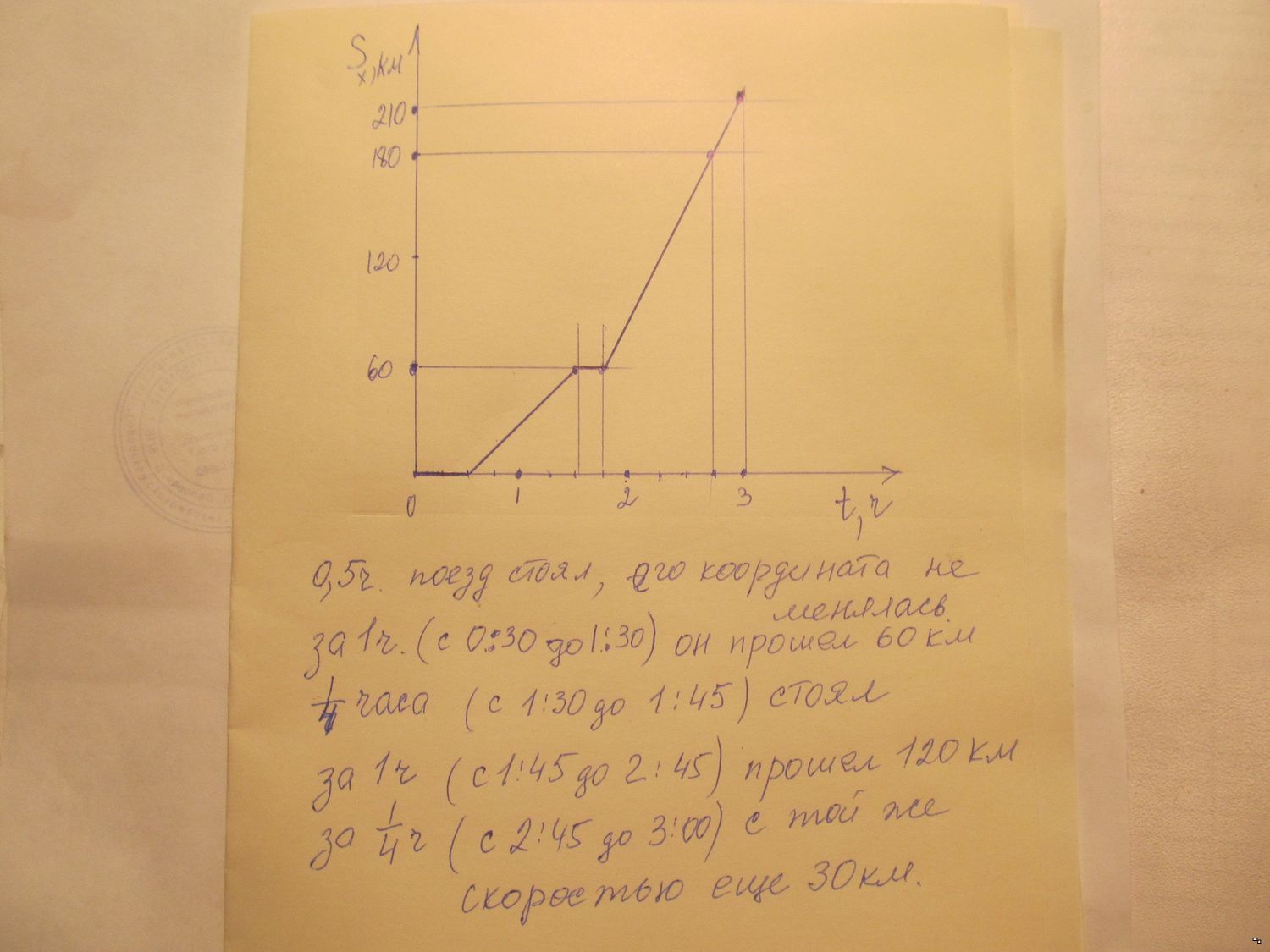 В 0 часов 00 мин началась посадка на поезд. В 0 часов 30 мин поезд отправился от станции и 1 час 00 мин поезд двигался равномерно со скоростью 60 км/ч. Затем он сделал остановку на 15 мин, а после остановки двигался равномерно со скоростью 120 км/ч в течение 1 час 15 минут. Постройте график зависимости пути от времени в интервале от 0 часов 00 мин до 3 ч 00 мин.